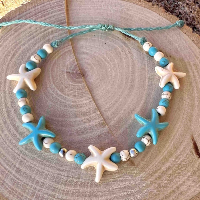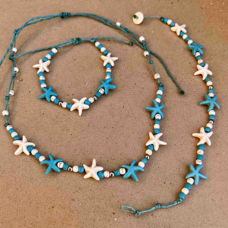 • Pack pulsera, tobillera y collar de estrellas y piedras naturales de Howlite blancas y piedras Turquesas. Las cuentas de color plateado son de acero inoxidable.