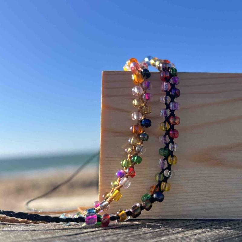 • Tobillera de cuentas multicolor e hilo encerado marrón o negro.